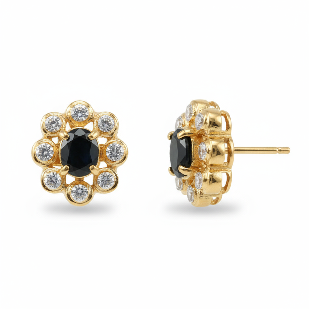 The Sapphire Radiance Earrings showcase 1.20 CTW AA-grade black sapphires in oval cuts, complemented by 0.14 CTW round-cut diamonds. Crafted from solid sterling silver plated with 18K yellow gold, these earrings deliver bold brilliance and refined style. Perfect for both formal events and daily wear, these designer earrings make a lasting impression.