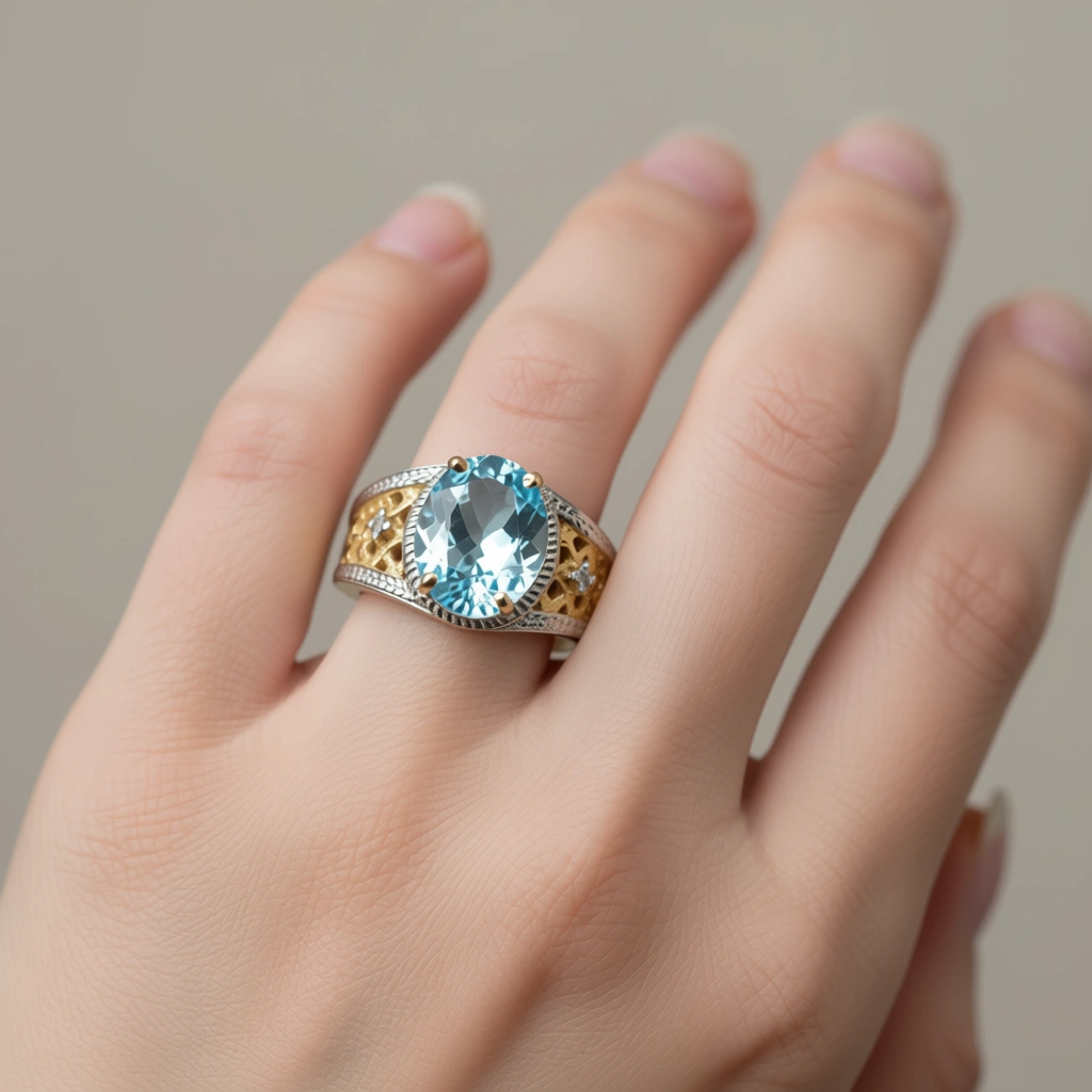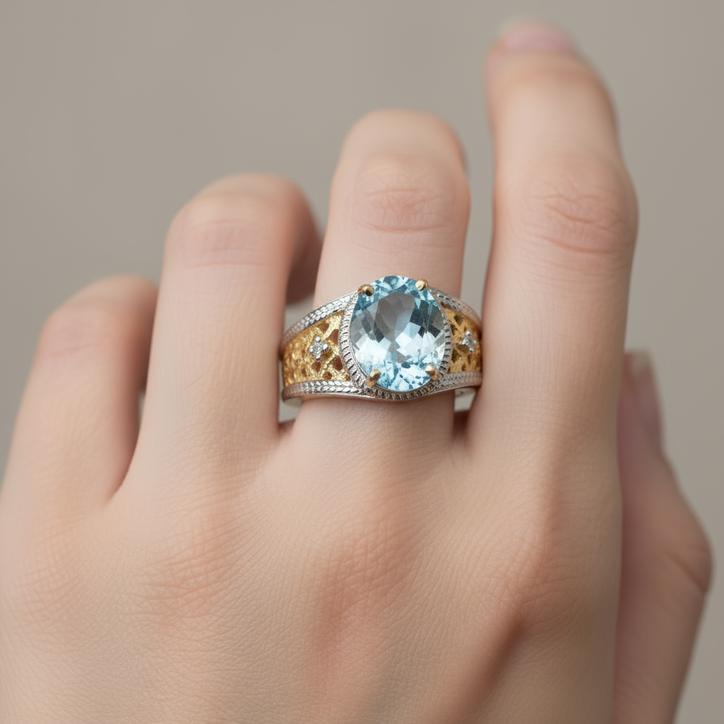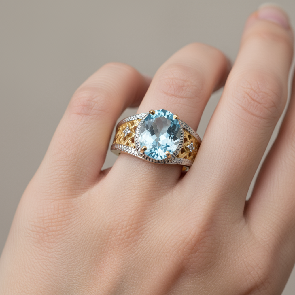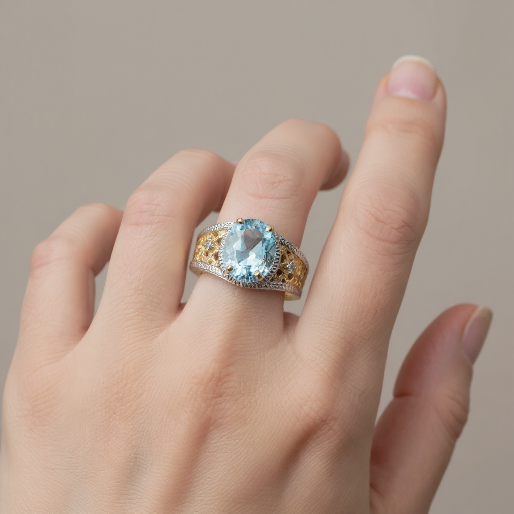 Radiate brilliance and grace with this Swiss Blue Topaz Diamond Halo Ring, an exquisite creation that captures the serenity of blue gemstones with a hint of golden warmth. The centerpiece is a 3.25 CTW oval-cut Swiss Blue Topaz—a gemstone celebrated for its vivid, oceanic hue—accented by sparkling round-cut diamonds (0.010 CTW, J color, I3 clarity) that add a refined shimmer. Crafted from solid sterling silver and luxuriously plated in 14K yellow gold, this size 7 womens designer ring reflects fine artistry and timeless sophistication. Perfect for both daily elegance and evening allure.
