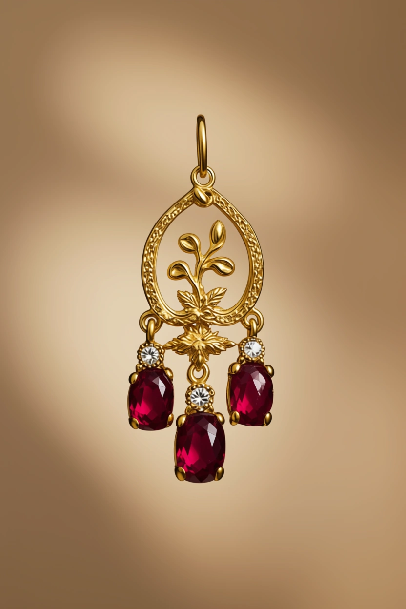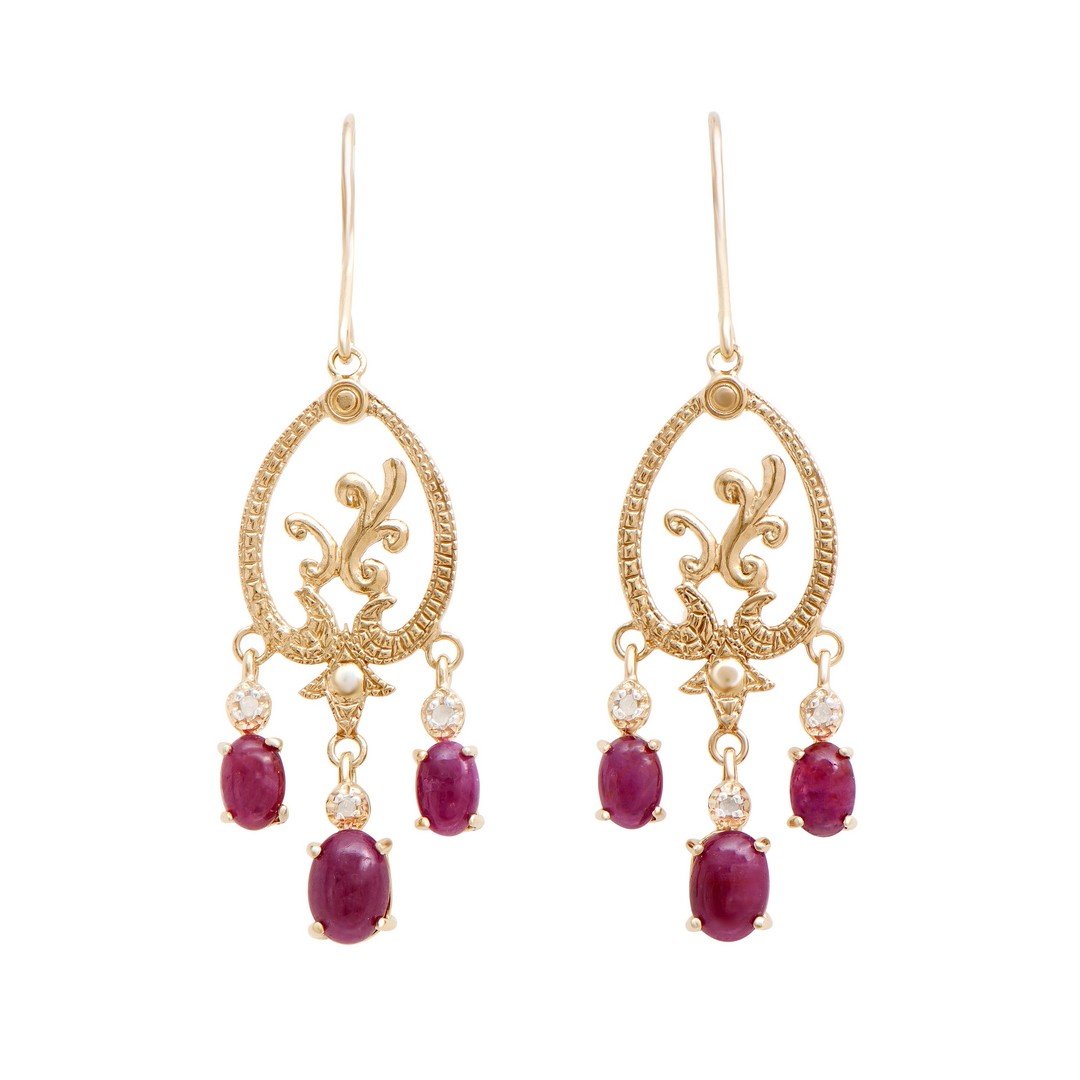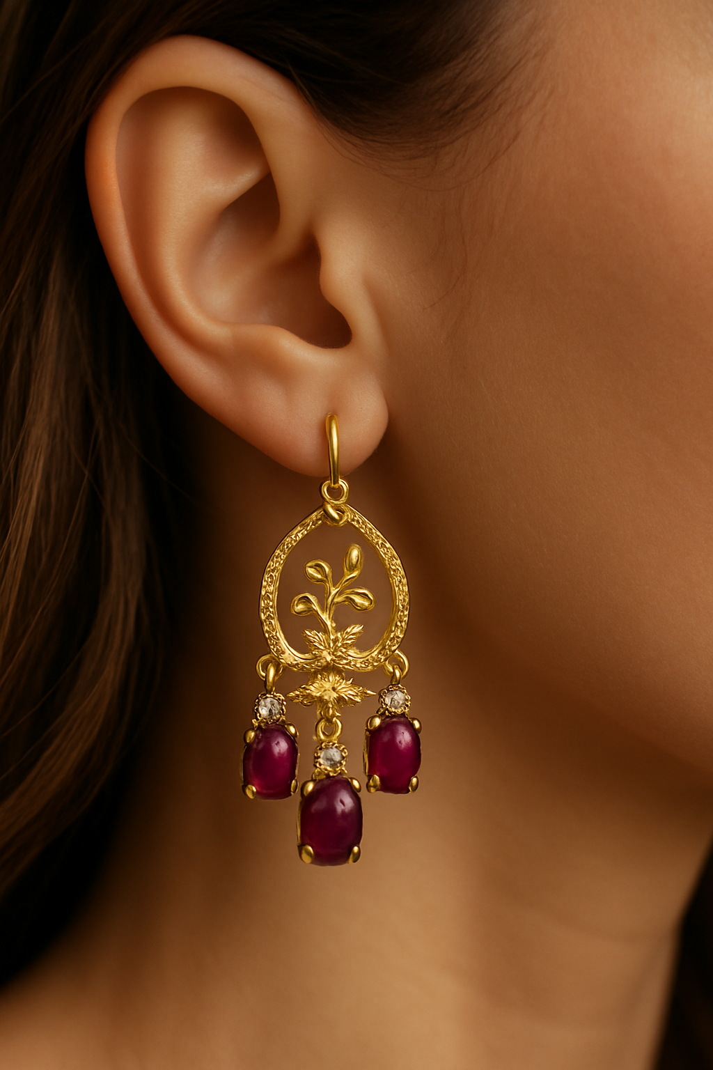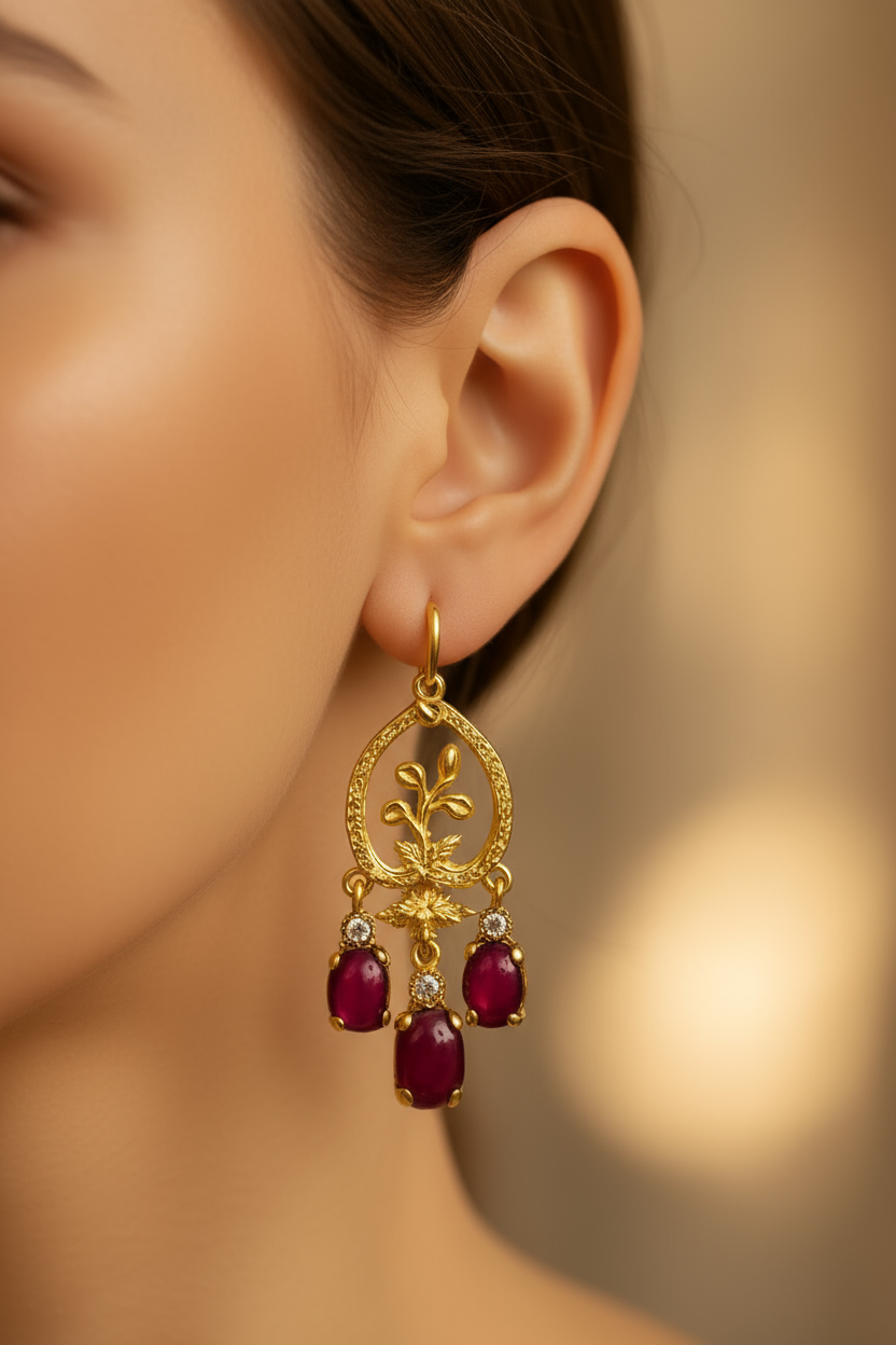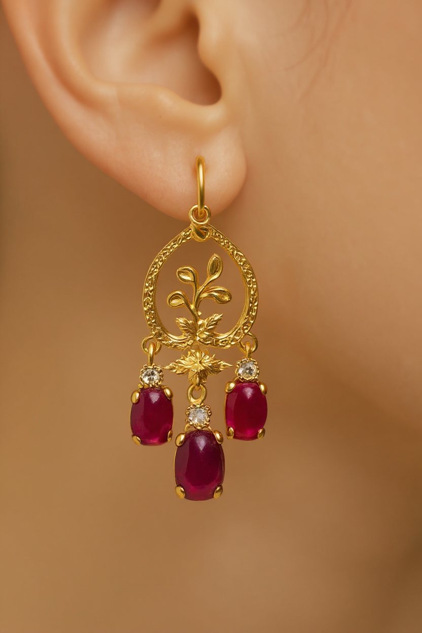 Radiating opulence and grace, the Crimson Royale Ruby Chandelier Earrings redefine statement jewelry. Handcrafted from solid sterling silver and finished with 18K yellow gold plating, this exquisite pair features 4.50 CTW of oval-cut AA-grade rubies that glow with passionate red hues.