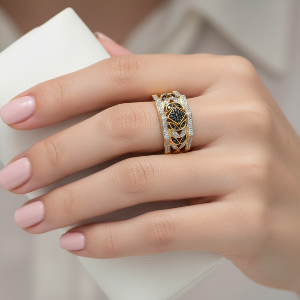 Expertly crafted from solid sterling silver and plated with rich 14K yellow gold, this designer ring embodies femininity, strength, and class — a piece that transitions effortlessly from day to night.