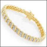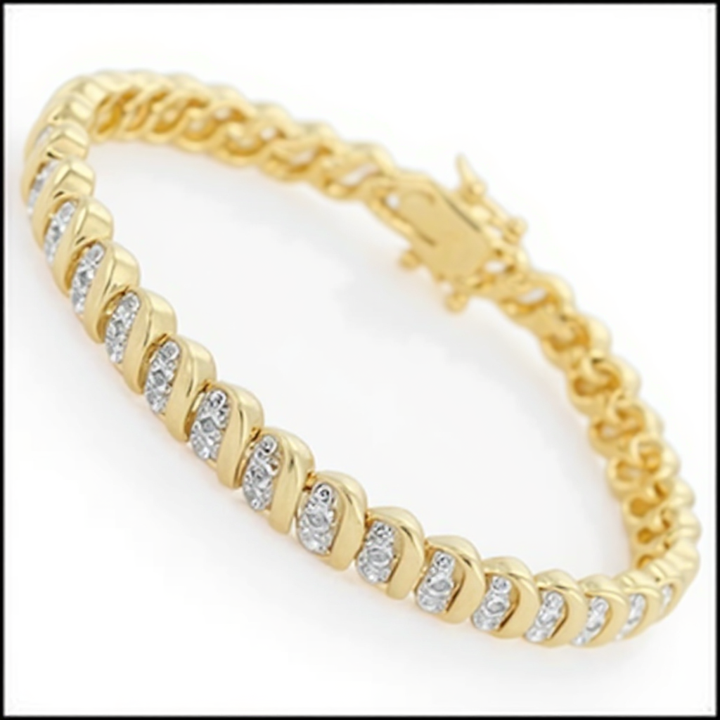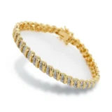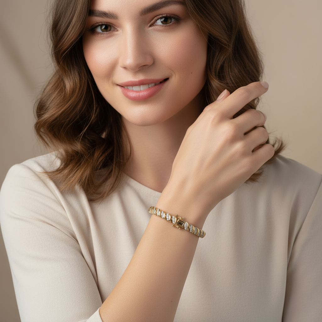 The Luminous Grace Diamond Bracelet offers a refined sparkle with 1.5 CTW round-cut diamonds (I-color, SI2 clarity) expertly set in solid sterling silver plated with 18K yellow gold. Measuring 7.5 inches, this designer bracelet gracefully wraps the wrist, combining durability with elegance.