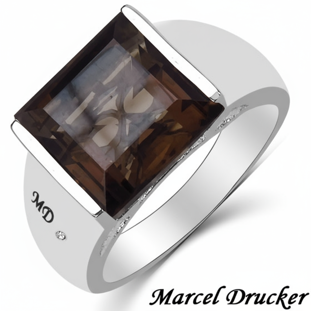 Elevate your elegance with the Marcel Drucker Topaz Diamond Ring, showcasing a 5.99 CTW princess-cut brown Topaz complemented by a delicate diamond accent. Expertly set in white gold rhodium over solid sterling silver, this size 8 designer ring captures timeless sophistication with a modern edge.
