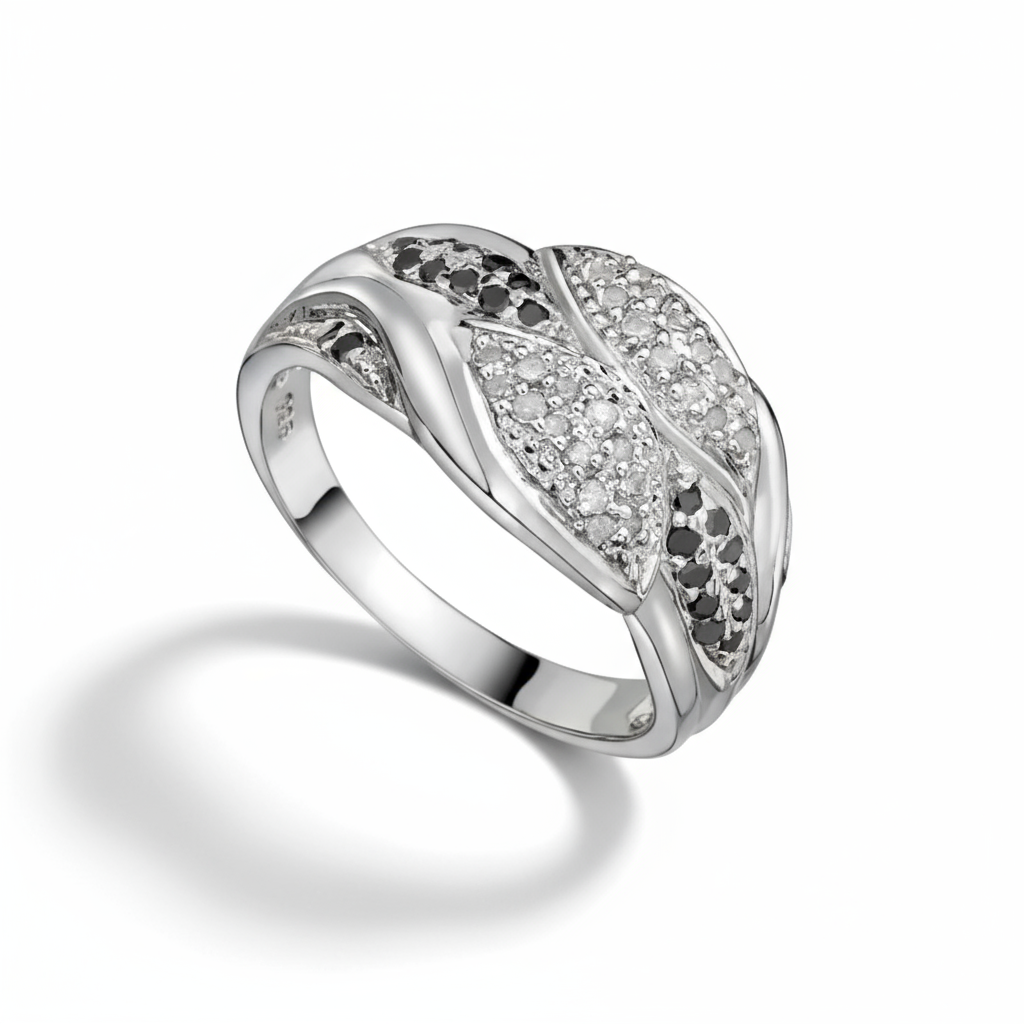 The Midnight Harmony Ring captures the allure of contrast with 54 black and white diamonds set in 14K white gold over sterling silver. A stunning 0.41 CTW masterpiece that radiates bold sophistication and timeless beauty.