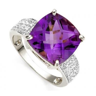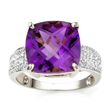 | Gemstone Details | Amethyst Color: Purple Grade: AAA Cut: Cushion Cut Total Carat Weight: 6.50 CTW Diamond Color: H (Near Colorless) Clarity: I1 Cut: Round Cut Total Carat Weight: 0.112 CTW |